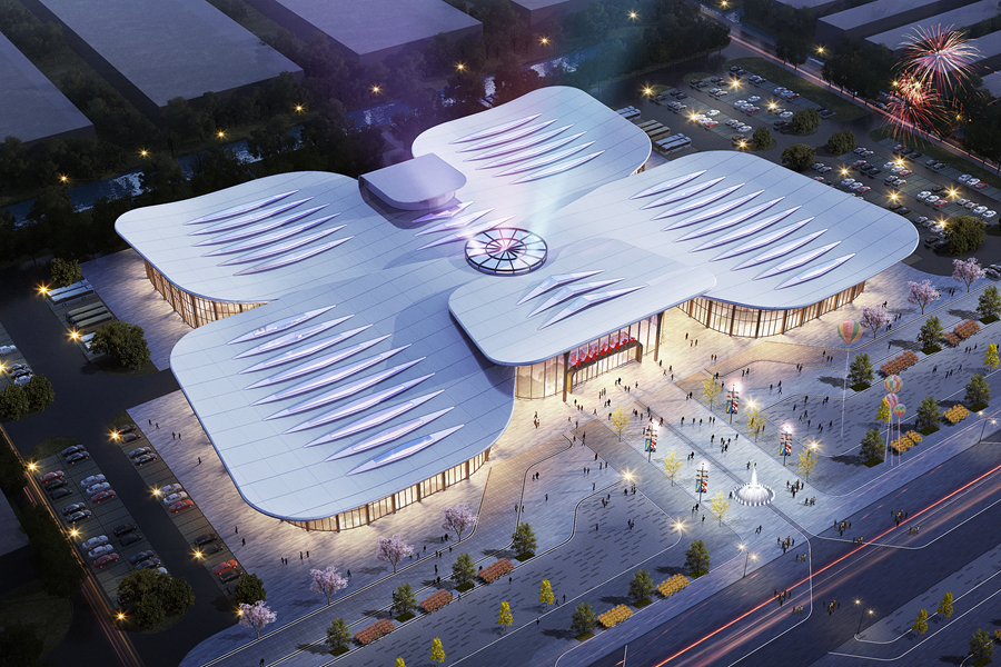 該工程是EPC設(shè)計施工總承包工程,為政府采購項目,采用綠色建筑二星級標(biāo)準(zhǔn),建筑整體形象取意“蝴蝶”,建筑面積約 19500 平方米,整體采用鋼結(jié)構(gòu)裝配式建筑結(jié)構(gòu)體系,項目建成后將成為商河最具地標(biāo)性的建筑。工程造型新穎、結(jié)構(gòu)復(fù)雜,對施工精度、準(zhǔn)確度要求高。