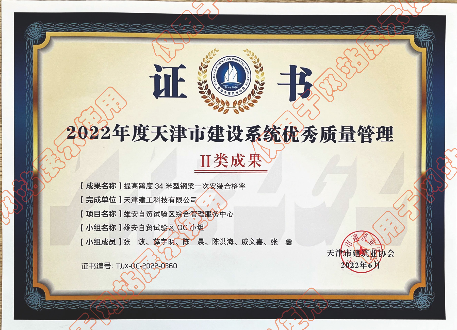 2022年度天津市建設(shè)系統(tǒng)優(yōu)秀質(zhì)量管理Ⅱ類成果_提高跨度34米型鋼梁一次安裝合格率