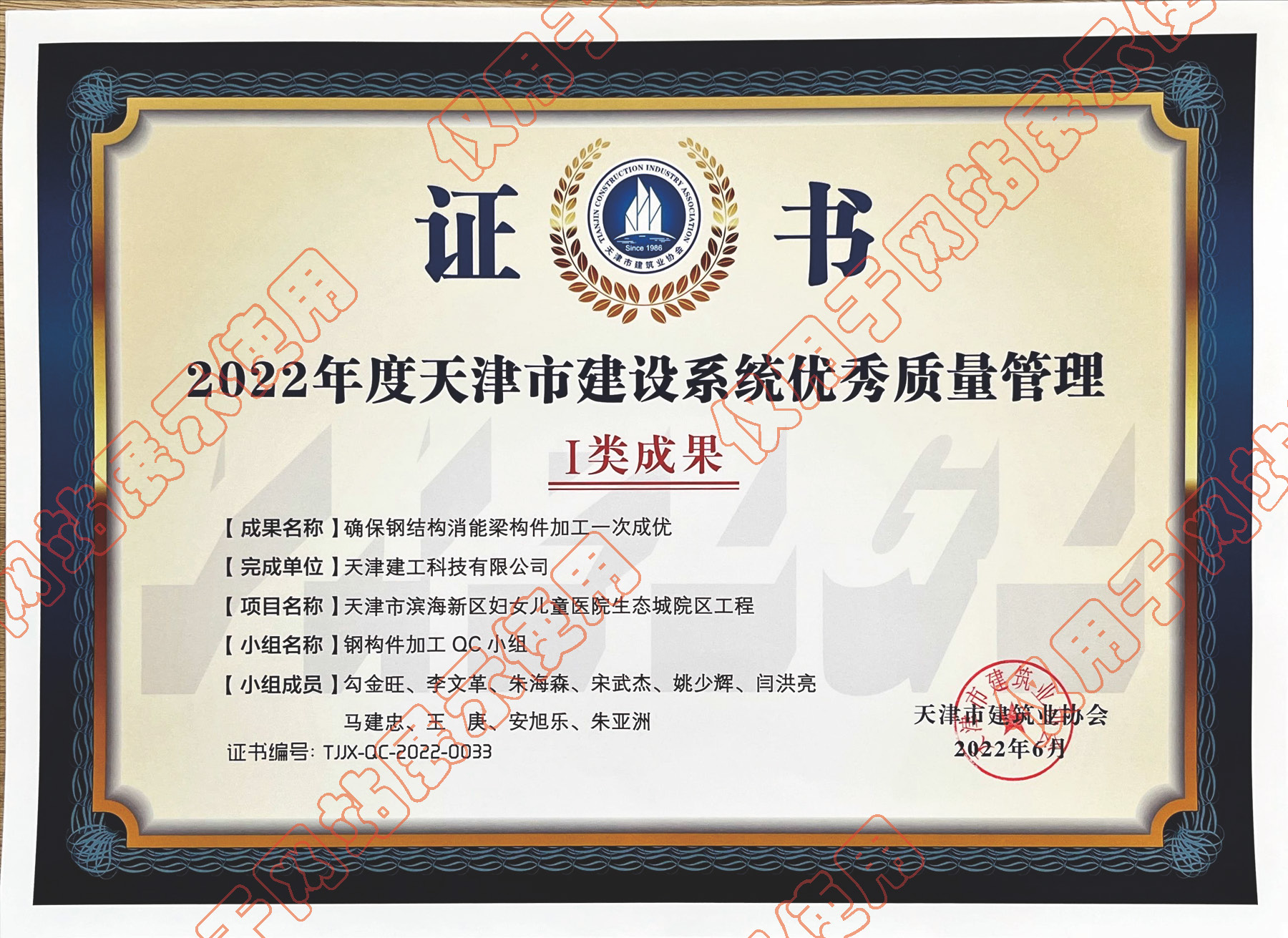 2022年度天津市建設(shè)系統(tǒng)優(yōu)秀質(zhì)量管理Ⅰ類成果_確保鋼結(jié)構(gòu)消能梁構(gòu)件加工一次成優(yōu)
